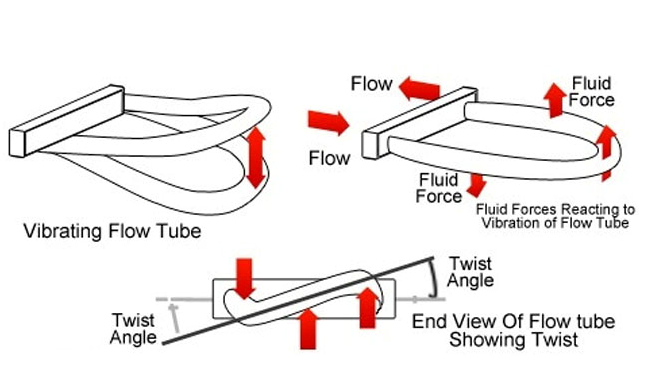 ای ارتعاش می کند. سپس نیرو های کوریولیس لوله را تغییر شکل می دهند و یک جزء ارتعاشی