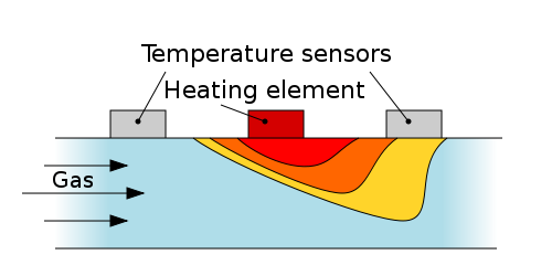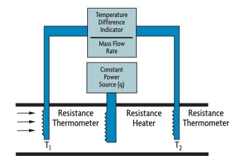 اندازه گیري فلوي جرمی بر اساس هدایت گرمایی مواد عمل می کند. این سیستم شامل دو سنسور حرارتی و یک منبع حرارتی میان این دو سنسور می باشد. منبع حرارتی ایجاد یک گرادیان دمایی نموده و حرکت سیال باعث جابجایی این پروفیل می گردد. بدین ترتیب اختلاف دماي اندازه گیري شده توسط سنسور هاي دمایی متناسب با فلوي جرمی سیال می گردد. این روش جهت اندازه گیري مقدار فلوي جرمی هواي فشرده، نیتروژن، گاز طبیعی و ... مورد استفاده قرار می گیرد.