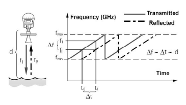این نوع سیستم اندازه گیري با استفاده از امواج رادیویی کار می کند و اختلاف زمان بین ارسال و دریافت را از طریق تکنیک موج پیوسته ي مدوله شده ي فرکانسی محاسبه می نماید. بدین ترتیب که زمان ارسال موج فرکانس f1 و در زمان دریافت فرکانس مبدا با توجه به تغییر دندانه اره اي مقدار دیگري مانند f0 خواهد بود. لذا مقدار تفاوت این دو فرکانس رابطه ي مستقیم با فاصله ي سطح مایع با ترانسمیتر راداري خواهد داشت.